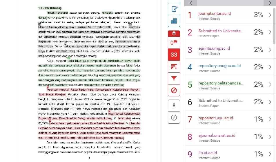 Contoh: 33% Similarity Index artinya tulisan pada dokumen tersebut mempunyai total plagiat sebanyak 33%.