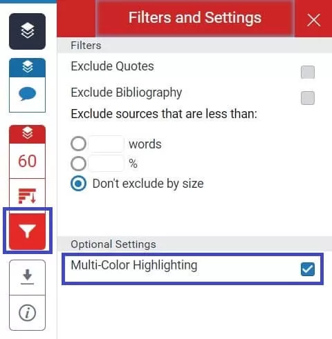 Turnitin menyebut warna-warna tersebut dengan Multi-color highlighting atau sorotan multi warna yang dapat diaktifkan maupun dinonaktifkan pada menu Optional Settings.