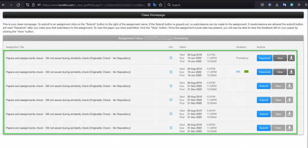 Lihat list assignment submission di dalam assignment inbox, masing-masing terdapat 3 button action: submit / resubmit, view, dan download. Kemudian pada kolom similiarity akan muncul persentase kemiripan dengan seluruh situs / data online / data tersimpan yang di crawl oleh turnitin.