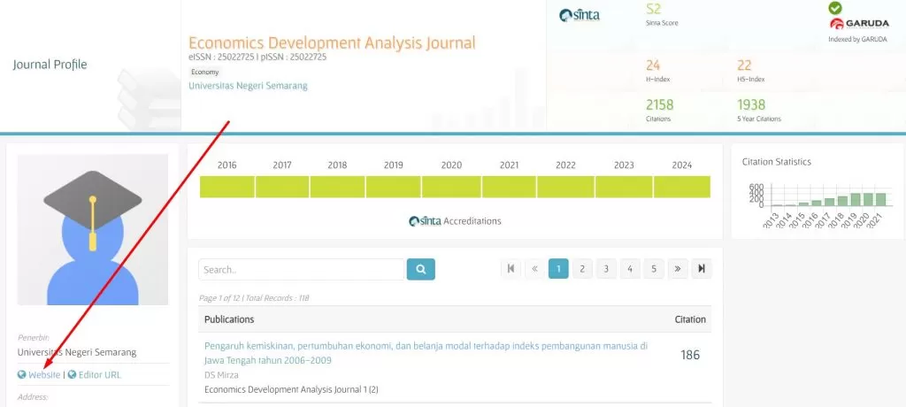 2. Pada halaman jurnal, Anda akan menemukan informasi tentang peringkat jurnal, statistik, serta daftar artikel yang diterbitkan.